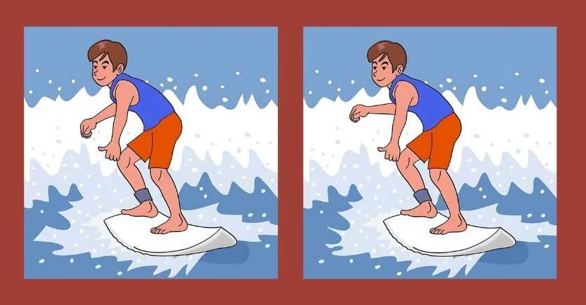 Nella foto vediamo un surfista che conquista le onde su una tavola da surf. A prima vista, potrebbe sembrare che i ragazzi in entrambe le foto siano ugi, ma se si gda da vicino, diventa chiaro che non è così: da qche parte ci sono alcune differenze che rendono le immagini diverse.